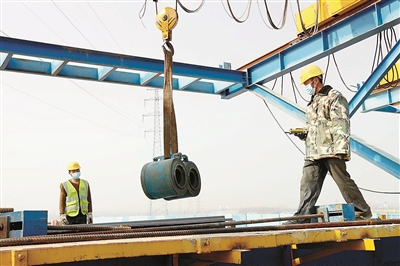 在河南省焦作市溫縣的國(guó)道207焦溫快速通道項(xiàng)目南水北調(diào)中線干渠跨渠橋梁施工現(xiàn)場(chǎng),建設(shè)者在進(jìn)行吊裝作業(yè)。 (圖片來(lái)源:人民視覺(jué))