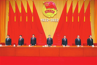 人民大會(huì)堂二層宴會(huì)廳氣氛隆重?zé)崃?。主席臺(tái)上方懸掛著“慶祝中國(guó)共產(chǎn)主義青年團(tuán)成立100周年大會(huì)”會(huì)標(biāo),后幕正中懸掛團(tuán)徽,團(tuán)徽下方是“1922-2022”字標(biāo),10面紅旗分列兩側(cè)。
