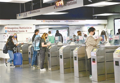 針對(duì)疫情形勢(shì),意大利將室內(nèi)強(qiáng)制口罩令延長(zhǎng)至6月15日,民眾進(jìn)入醫(yī)院、療養(yǎng)院等場(chǎng)所以及乘坐公共交通工具時(shí)仍需佩戴口罩。圖為近日,羅馬市民在通過(guò)地鐵站檢票口。 新華社記者 金馬夢(mèng)妮 攝