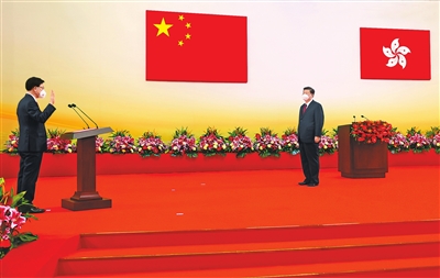 習(xí)近平指出,中華民族偉大復(fù)興已經(jīng)進入不可逆轉(zhuǎn)的歷史進程。推進“一國兩制”在香港的成功實踐是這一歷史進程的重要組成部分。我們堅信,有偉大祖國的堅定支持,有“一國兩制”方針的堅實保障,在實現(xiàn)我國第二個百年奮斗目標的新征程上,香港一定能夠創(chuàng)造更大輝煌,一定能夠同祖國人民一道共享中華民族偉大復(fù)興的榮光。