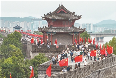 9月30日,湖北襄陽(yáng)古城景區(qū)、街頭掛上一面面五星紅旗,喜慶氣氛吸引不少游客前來(lái)游覽拍照。圖片來(lái)源:視覺(jué)中國(guó)