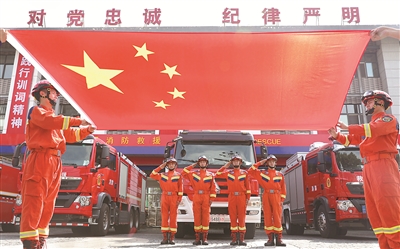 9月30日,在江蘇省淮安市洪澤區(qū)消防救援大隊(duì),消防指戰(zhàn)員向國(guó)旗敬禮。圖片來(lái)源:視覺(jué)中國(guó)