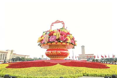 這是近日拍攝的北京天安門(mén)廣場(chǎng)上的“祝福祖國(guó)”巨型花籃。 圖片來(lái)源:視覺(jué)中國(guó)