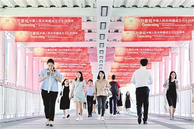近日,香港特別行政區(qū)金鐘一帶的燈柱、圍欄及天橋等處,紛紛裝飾上寫(xiě)有慶祝國(guó)慶的橫幅及彩旗。圖片來(lái)源:視覺(jué)中國(guó)