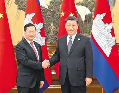 10月19日上午,國家主席習(xí)近平在北京人民大會堂會見來華出席第三屆“一帶一路”國際合作高峰論壇的柬埔寨首相洪瑪奈。 新華社記者 黃敬文 攝